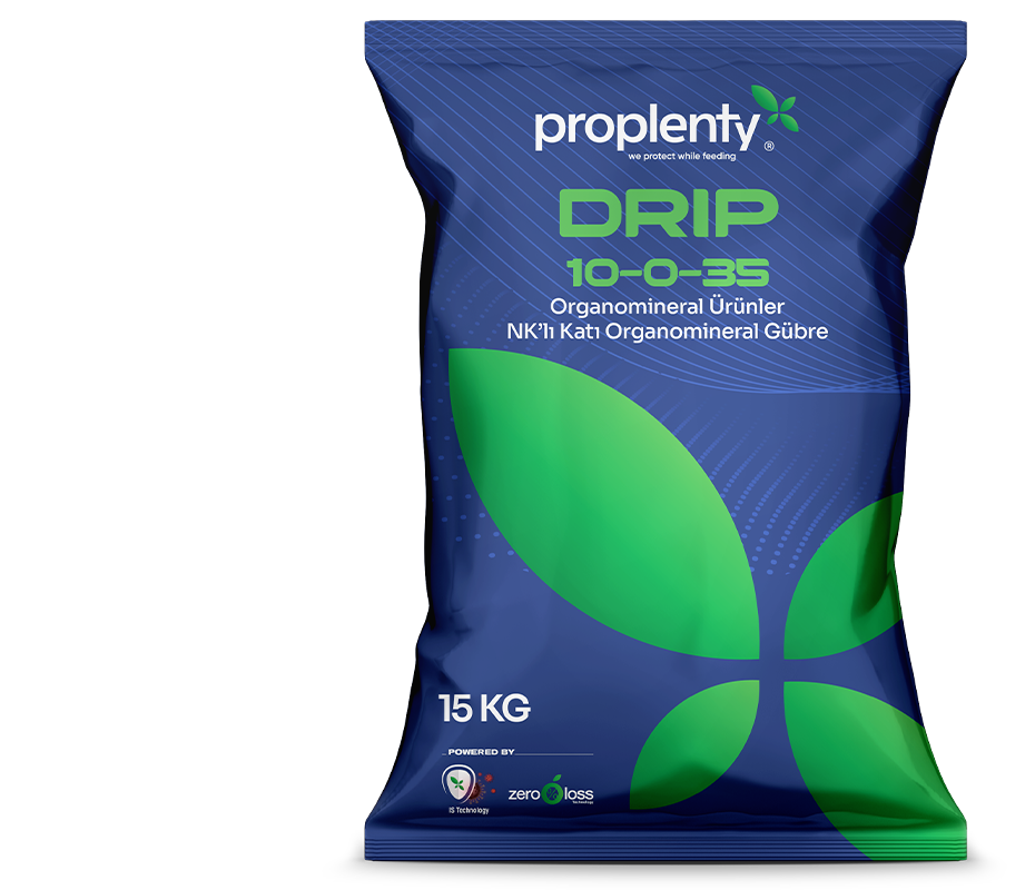 DRIP 10-0-35; • Kaliteli hammaddelerden, yüksek teknoloji ile üretilmiştir. • Sodyum, klor vb. zararlı metaller içermez. • Düşük tuz içeriği ve dengelenmiş pH’sı sayesinde bitkinin her döneminde herhangi bir fitotoksisiteye neden olmadan uygulanabilir. • Bitki yetiştiriciliği için gerekli olan mikro elementler Glysine amino asiti ile şelatlanmıştır. • Azot kaynağı; Organik azot, Üre, Amonyum ve Nitrat Azotu içerir. • Potasyum kaynağı; 3 farklı Potasyum kaynağı kombinasyonudur. • Üretim teknolojisi sayesinde suda hızla %100 çözünür dolayısıyla hiçbir kalıntı bırakmaz ayrıca amino asit ile şelatlı olması sayesinde kök dokularından kolaylıkla emilerek bitki bünyesine giriş yapar. • Damlama sulama sistemi, salma sulama ile kök bölgesine uygulanır, tüm bitkiler için topraktan uygulama dozu 10 gün ara ile 3 kez 1,5 Kg/da’dır. Hasat sonuna kadar kullanılır. • Sert ve dolgun meyve yetiştiriciliğini teşvik ettiği gibi bitkinin gelişmesi için gereken azotu da ihtiva eder. • Bitkinin hastalıklara karşı direncini arttırır. • Meyvenin irileşmesini, dolgun ve sert olmasını, iyi renklenmesini dolayısı ile tamamen kaliteli meyveyi hedef alan bir bitki besleme ürünüdür. • Uygulama sonrası Şeker içeriğindeki üretim miktarını ve kalitesini arttırır. • Homojen, Tozsuz, Akışkan, Kekleşme ve Topaklanma yapmaz.