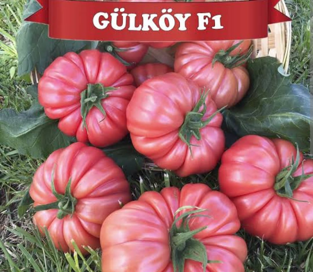 Gülköy F1. Sırık pembe köy domatesi, güçlü, boğum arası kısa, erkenci. Basık, dilimli, sert, 300 gr, parlak pembe, tat ve aroma çok iyi. Bahar, güz ve tek sezon sera.